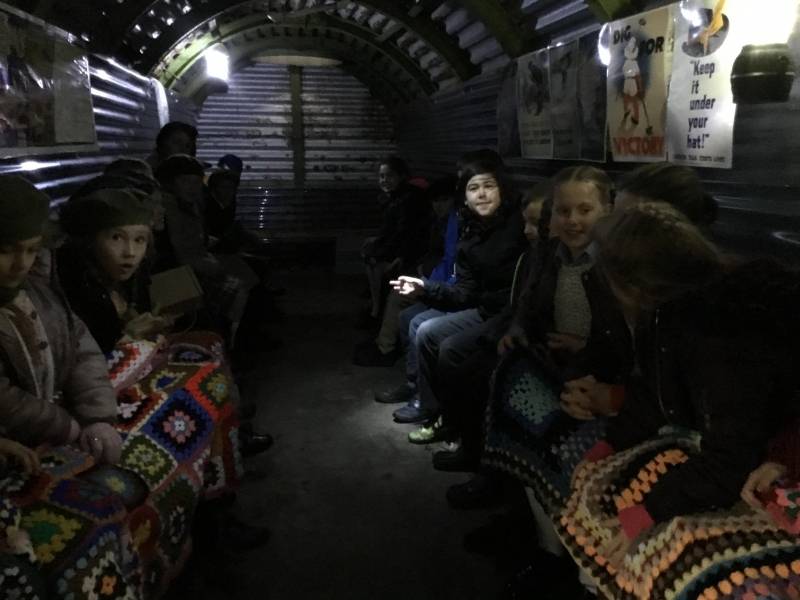 Luckily, we have two Anderson shelters on our school grounds, so we didn't have far to walk and we were soon safely tucked up inside. We wrapped blankets around us and sang some old war time songs, including ‘Run rabbit run run run’.